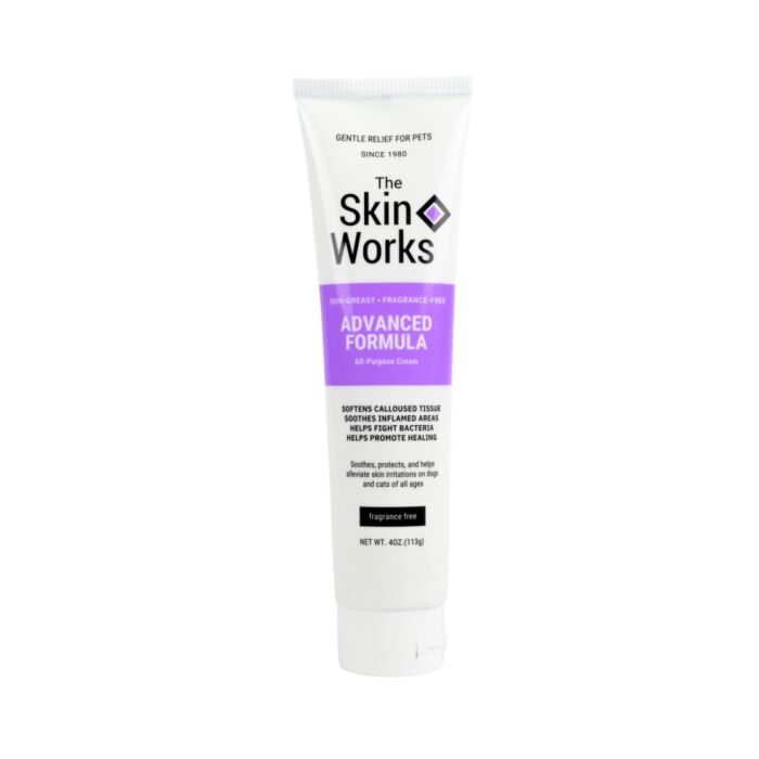 Coat Handler Skin Works is een niet-vette, geurvrije crème die ontwikkeld is om de huid van huisdieren te verzachten, te herstellen en te beschermen. Hij werkt kalmerend bij ontstoken of geïrriteerde plekken, helpt bij het verzachten van ruwe of eeltige zones (zoals voetzolen of ellebogen), en hydrateert droge huid zonder vettige resten achter te laten.