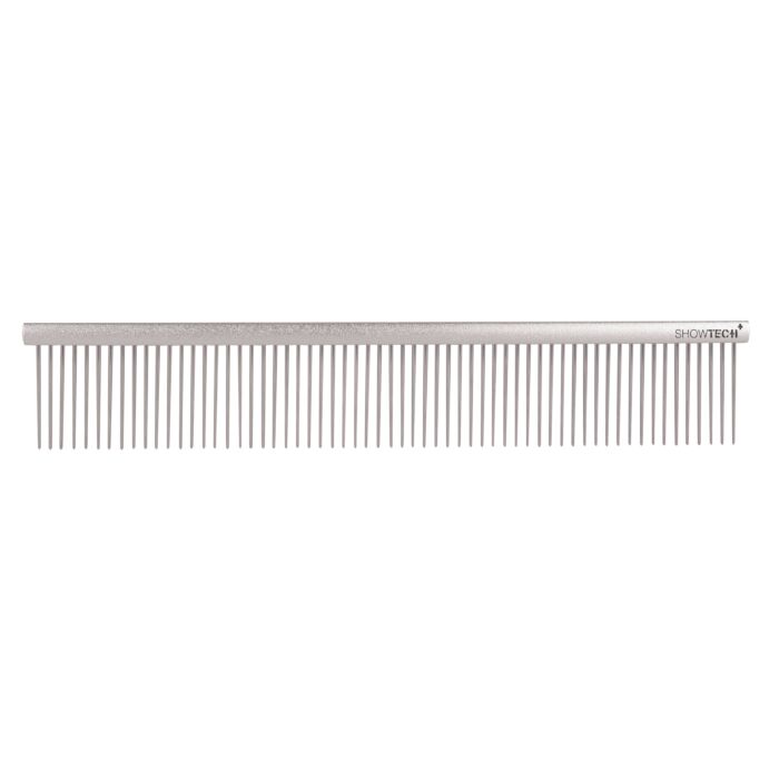 De Show Tech Featherlight Professional Comb Silver (25 cm) is een premium afwerkingskam bedoeld voor verzorgers die comfort én kwaliteit belangrijk vinden. De kam heeft een stevig aluminium frame dat het gewicht laag houdt, waardoor langdurig gebruik minder belastend is voor hand en pols. De tanden zijn van gepolijst roestvrij staal, met afgeronde punten — dit voorkomt scherpe randen en vermindert het risico op beschadiging van de huid of haren.