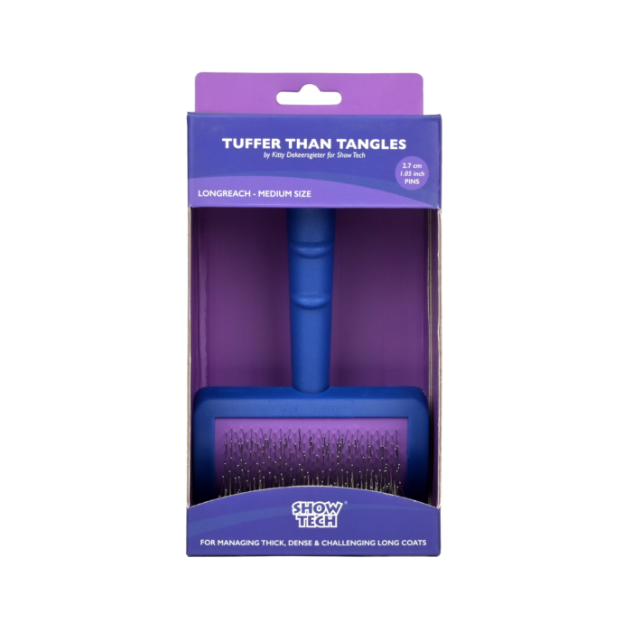 De Show Tech Tuffer Than Tangles LongReach Medium is een medium-maat long-reach slickerborstel bedoeld om grotere oppervlaktes te bereiken met minder inspanning. De borstel is onderdeel van de Tuffer Than Tangles reeks, wat betekent dat hij gebouwd is voor duurzaamheid: stevige pinnen die klitten en losse ondervacht effectief aanpakken. De medium maat maakt hem veelzijdig — niet te groot dat hij onhandig is, maar wel groot genoeg om efficiënt grote vachtvlakken te behandelen. Het handvat is ergonomisch zodat je grip houdt bij langdurig gebruik.