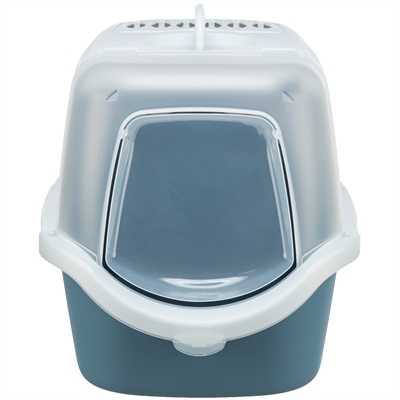 Trixie Kattenbak Vico Open Top Met Kap Blauwgrijs/Wit 56X40X40 cm is een makkelijk te gebruiken kattenbak met opklapbare voorkant voor gemakkelijke reiniging.